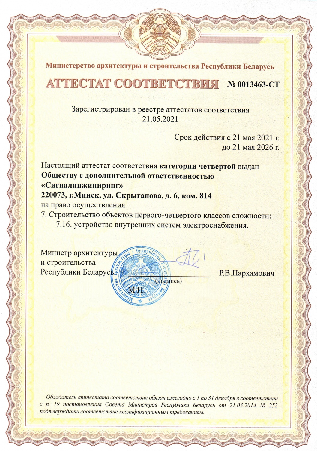 Аттестат соответствия на право осуществления деятельности по устройству внутренних систем электроснабжения.