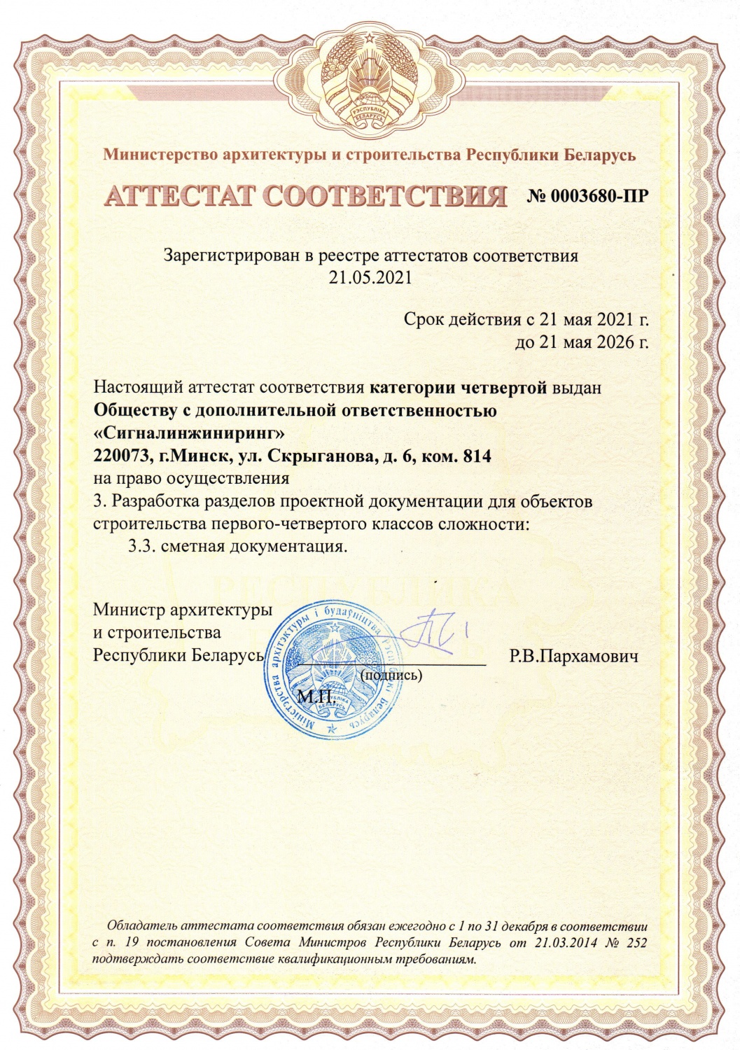 Аттестат соответствия на право осуществления разработки разделов проектной документации и сметной документации.